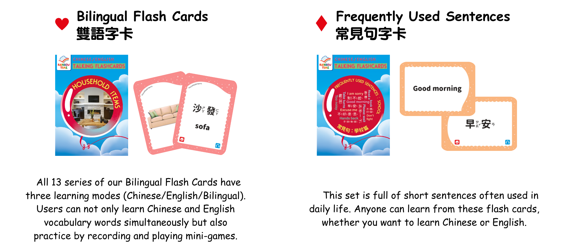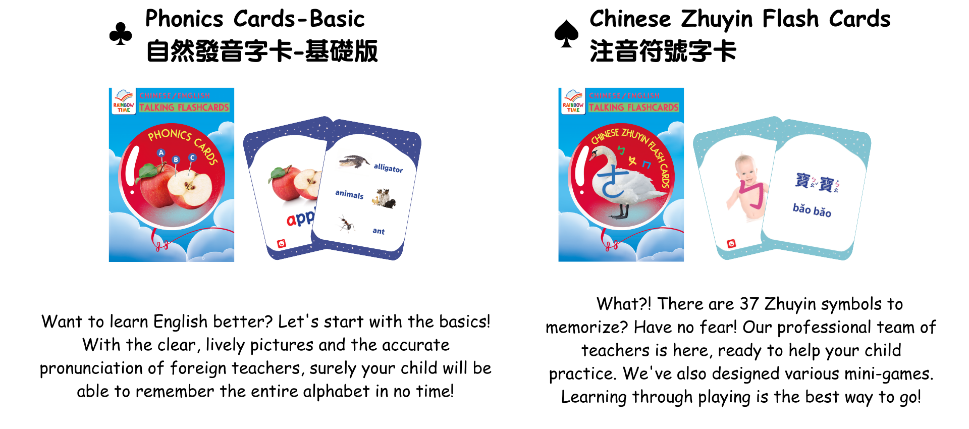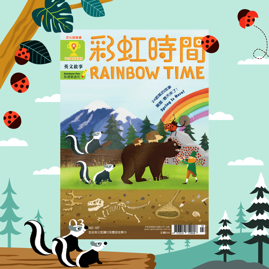 Rainbow Time has been publishing magazines for over 20 years. We encourage learning English by listening to fun stories, so as to intrigue readers effectively and improve their English skills. Rainbow Time stories are most suitable for parent-child shared reading. Current products include: