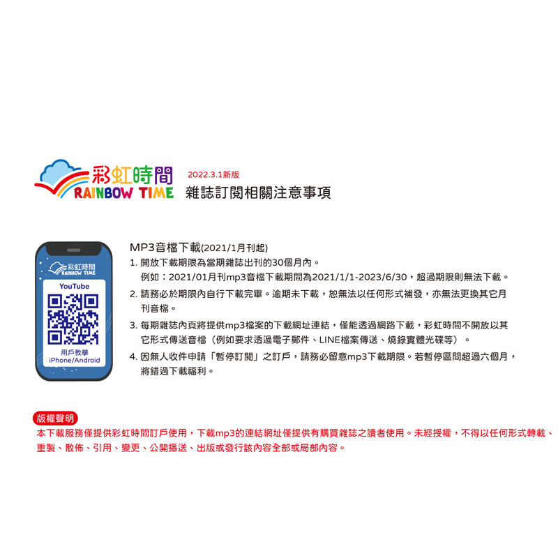 1. 彩虹時間雜誌適合3-12歲小朋友閱讀(收聽)。